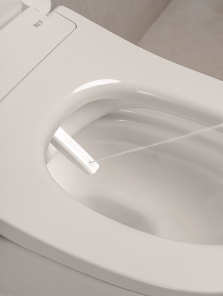 W dobrze zaprojektowanej toalecie myjącej higiena nie kończy się na samej wodzie. Ważne jest również to, jak urządzenie dba o czystość elementów, które pracują najintensywniej. W In-Wash® Ona dysza myjąca czyści się automatycznie przed i po użyciu, a dodatkowo jest dezynfekowana światłem UV. Marka Rocawskazuje skuteczność redukcji bakterii na poziomie 99,9%, co przekłada się na większy spokój w codziennym użytkowaniu.